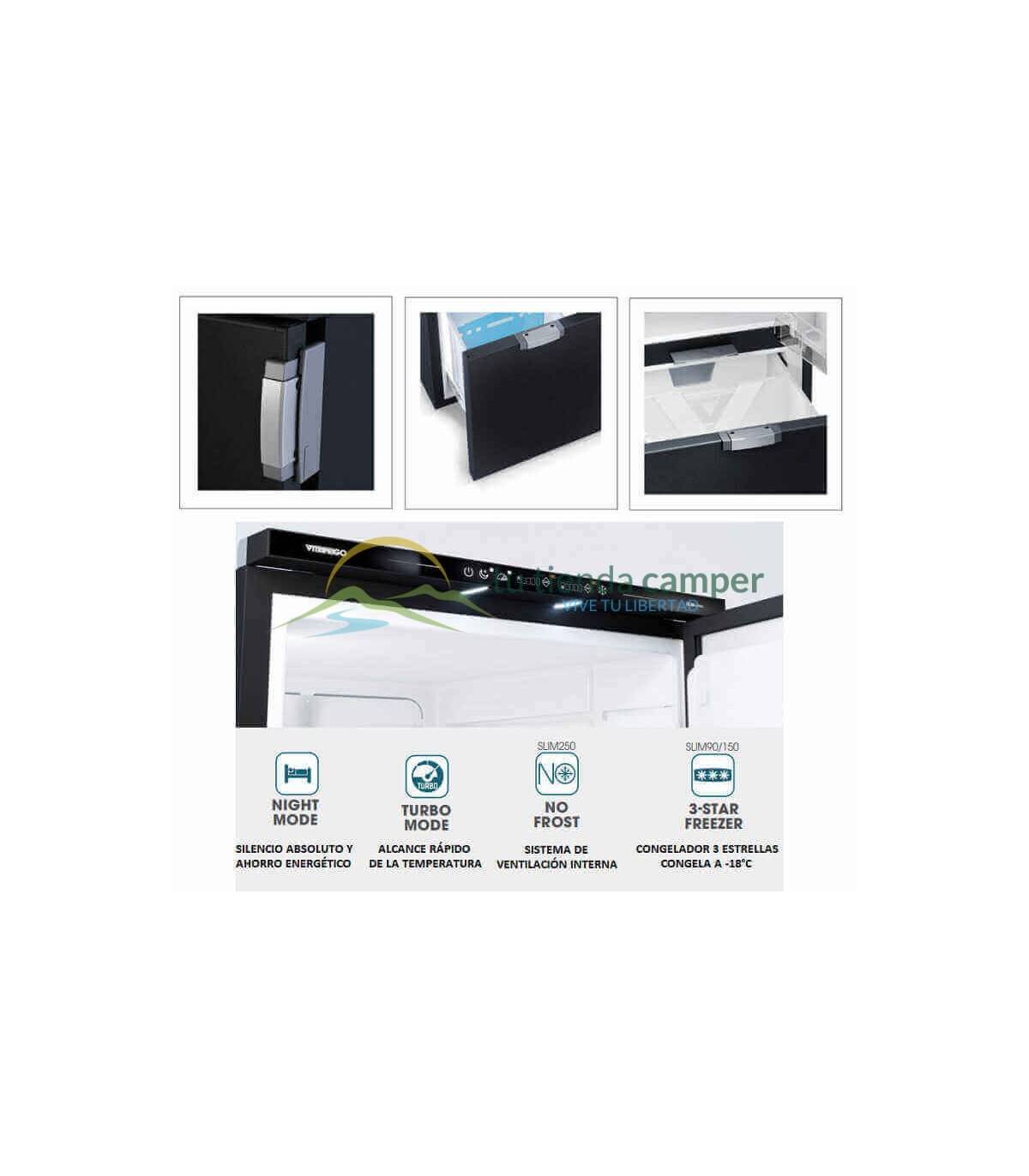 El frigorífico Vitrifrigo SLIM90 Chromelock es un frigorífico de compresor compacto, lo que proporciona una opción alternativa para instalaciones en conversiones de furgonetas de distancia entre ejes corta y larga. Tiene un compartimento congelador integrado de 10 l y puede funcionar con sistemas de batería de 12 V o 24 V CC, por lo que es adecuado para su uso en una amplia gama de aplicaciones, incluidas autocaravanas, autocaravanas, barcos, caravanas, vehículos recreativos y aplicaciones aisladas más pequeñas. Este diseño de Chromelock revisado pesa menos que la versión anterior de Airlock y presenta un diseño de la maneta mejorado.